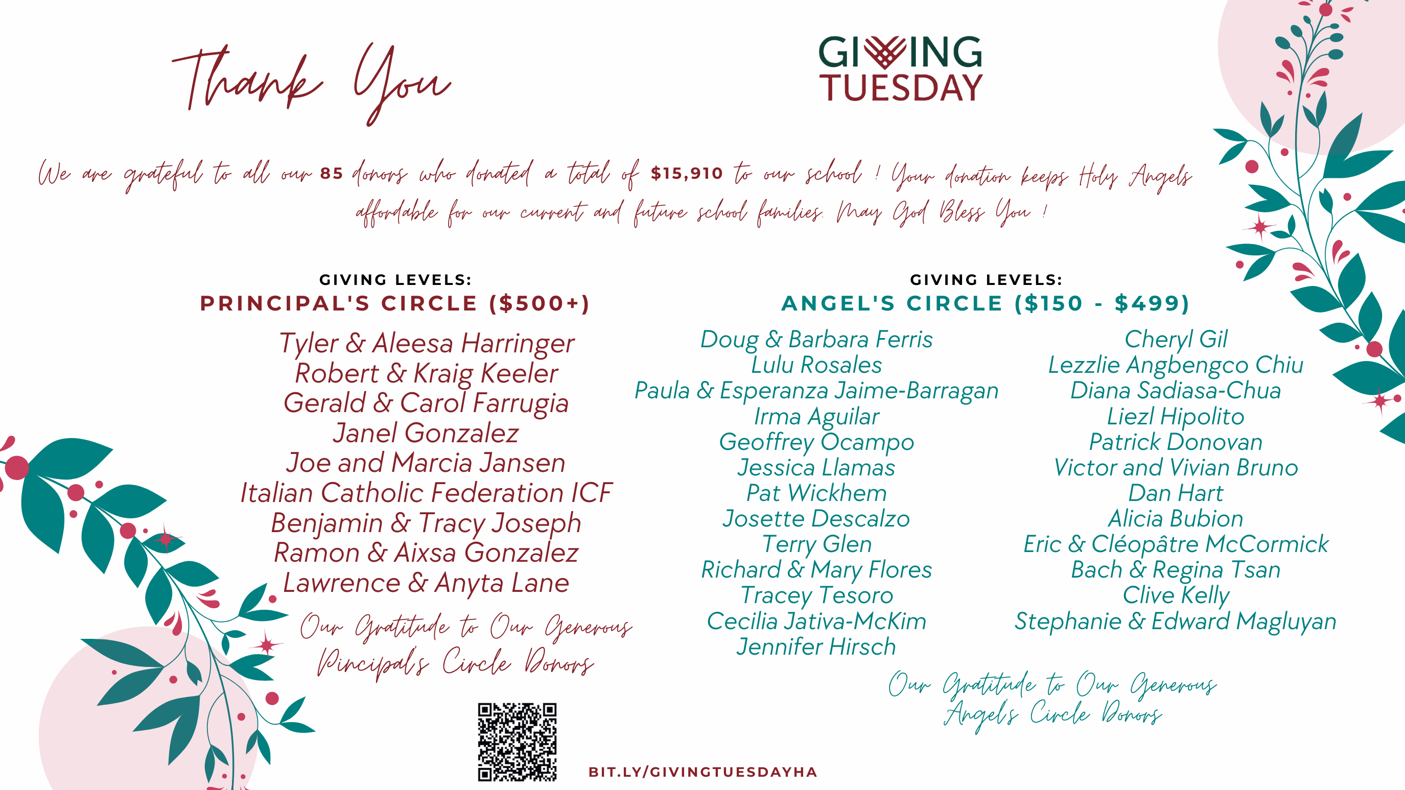 We are so appreciative of the 85 (and counting) donors who gave during our Giving Tuesday campaign. It's not too late if you want to make a year-end donation. Thank you, Angels!